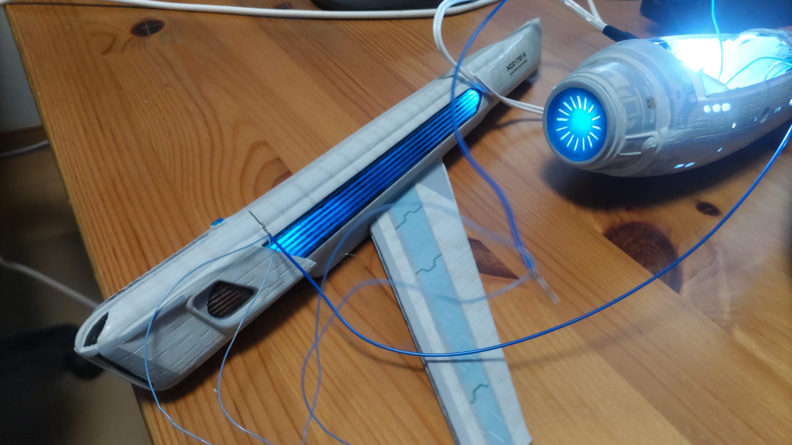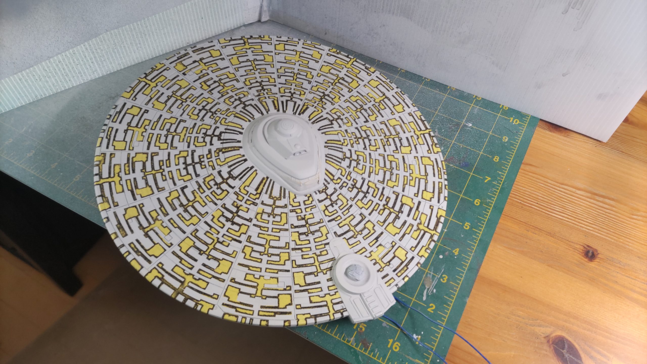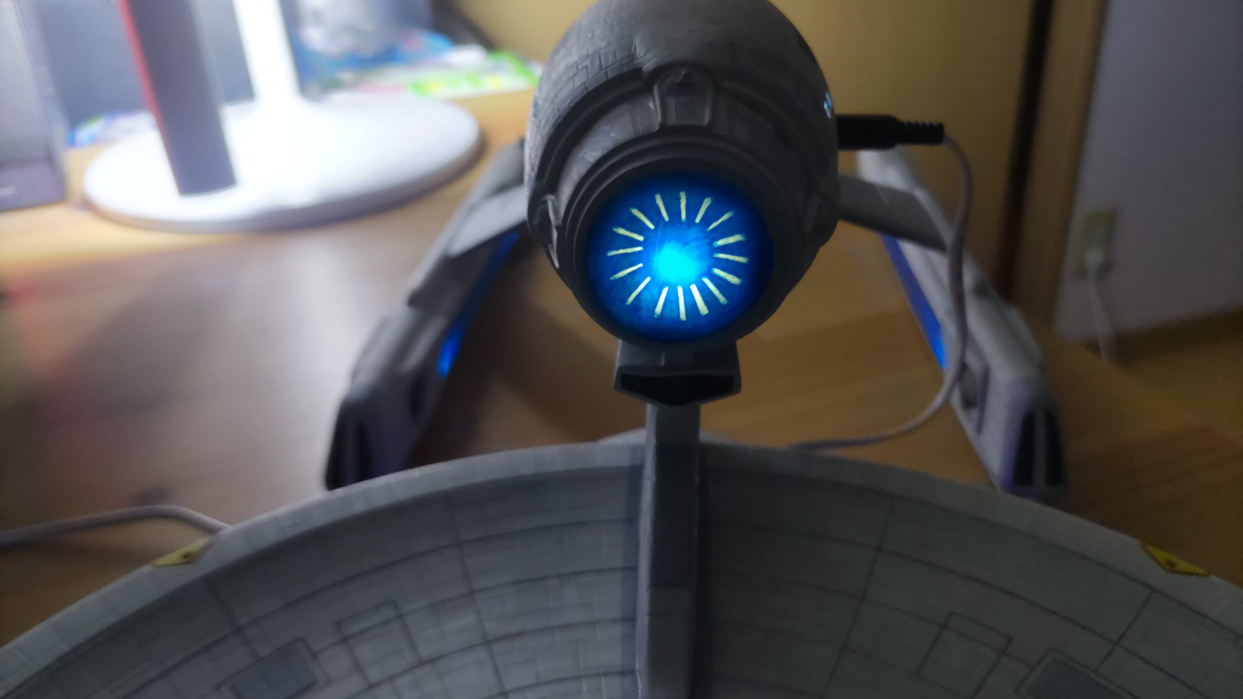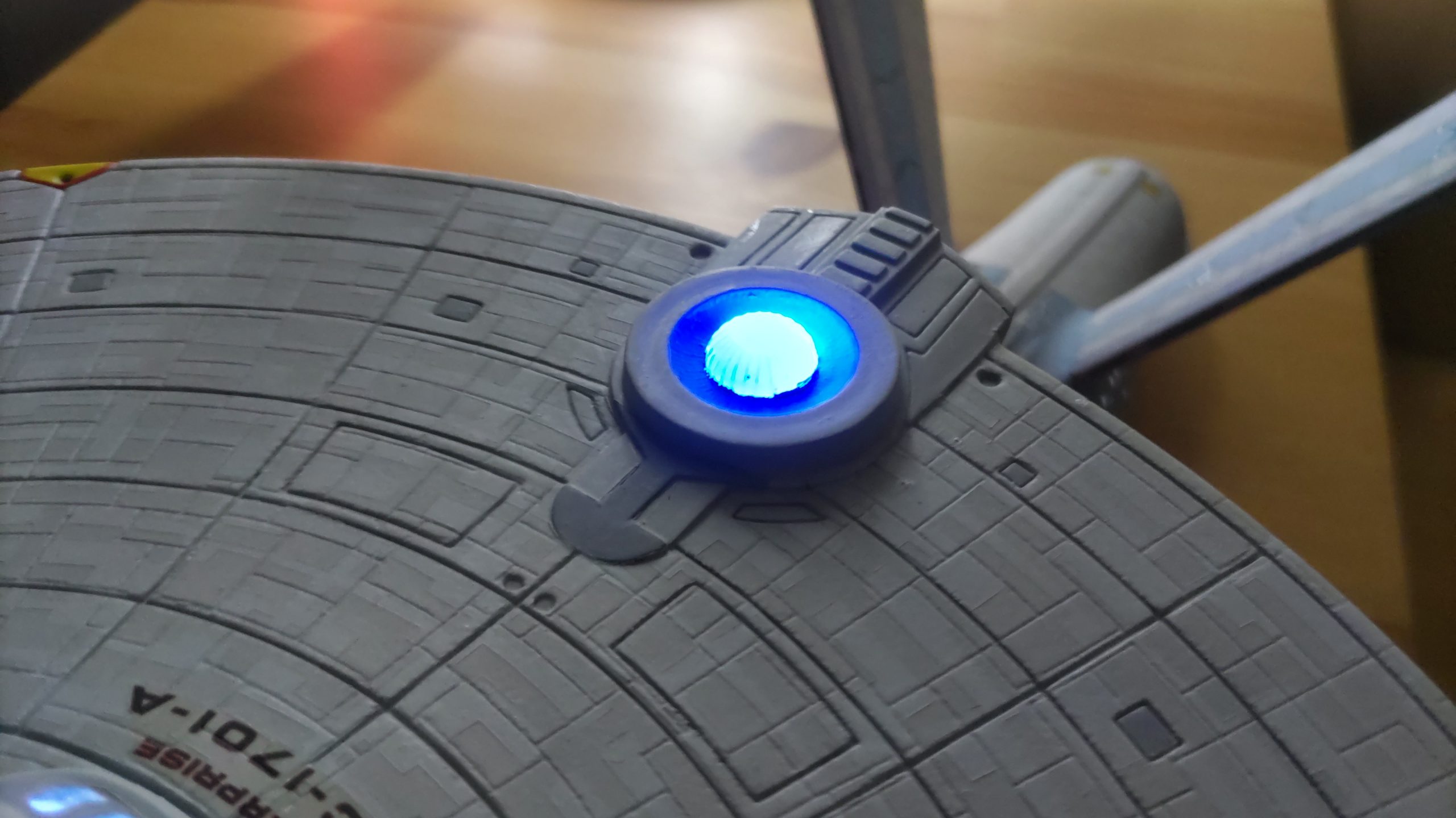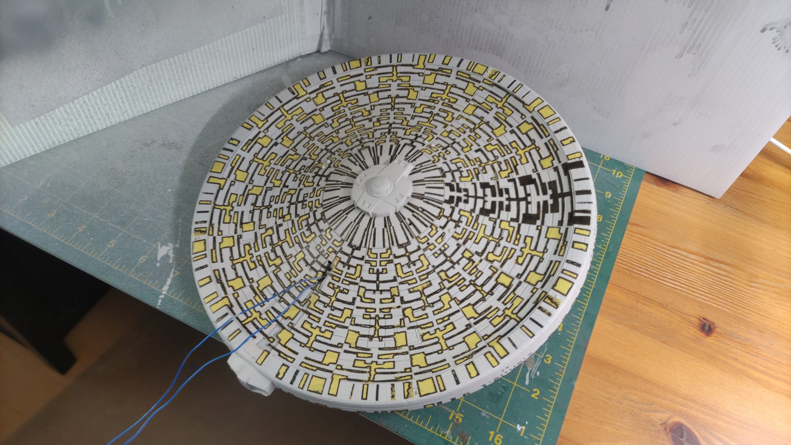 The deflector dish was a bit of trouble. I tried a couple of different ways to give it a ‘starburst’ look but ended up sanding down the whole thing back to bare plastic before the final iteration. That one was basically adding a ring of small hand cut stickers on the base plastic, then spraying clear blue and sealing it all with the matt varnish. The back white ‘bare’ plastic give a good flared look with the lights off, and helps brighten the ‘glow’ when the backlight is on.