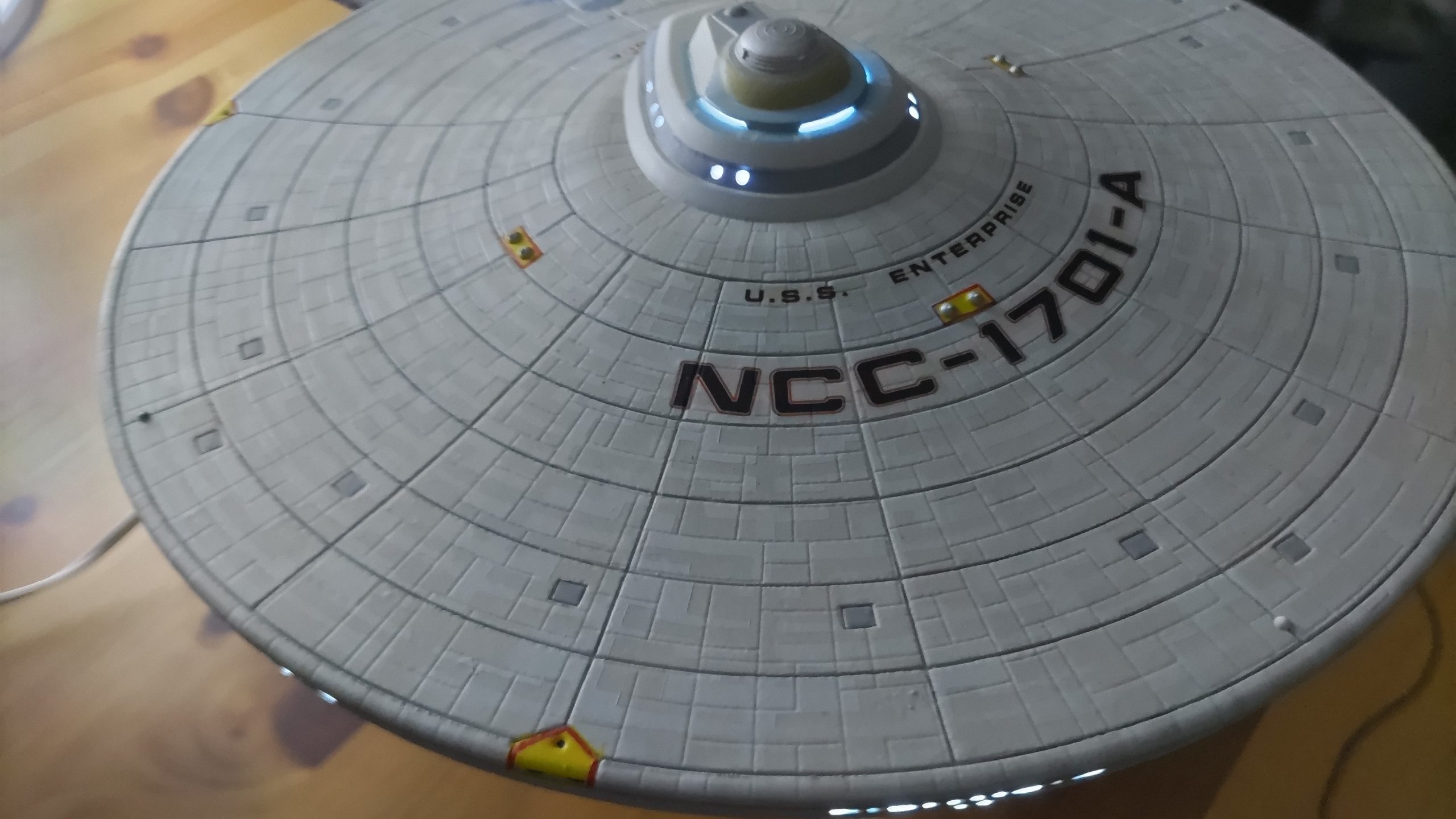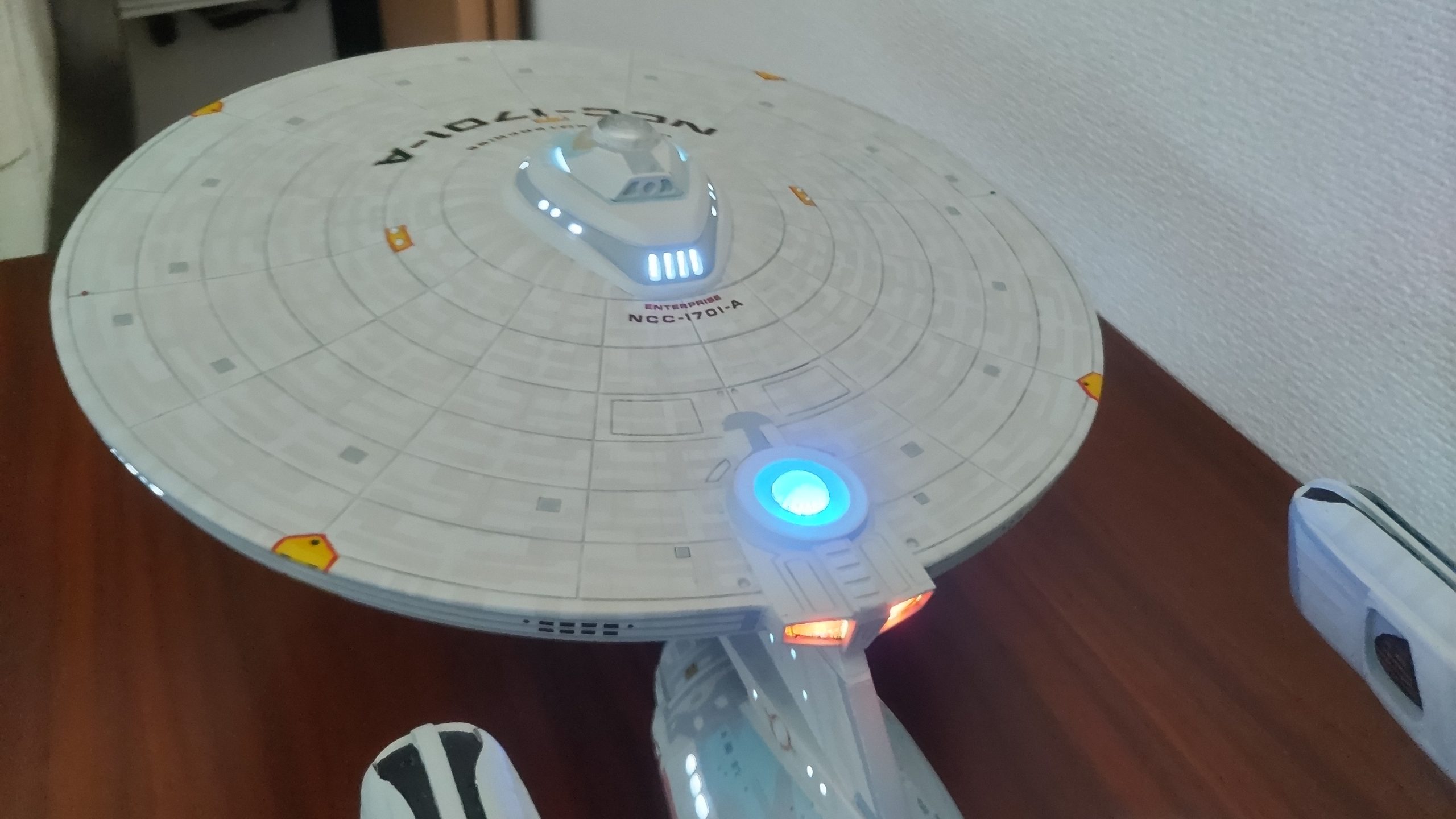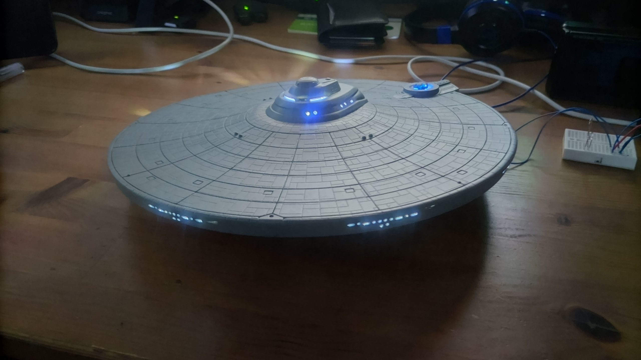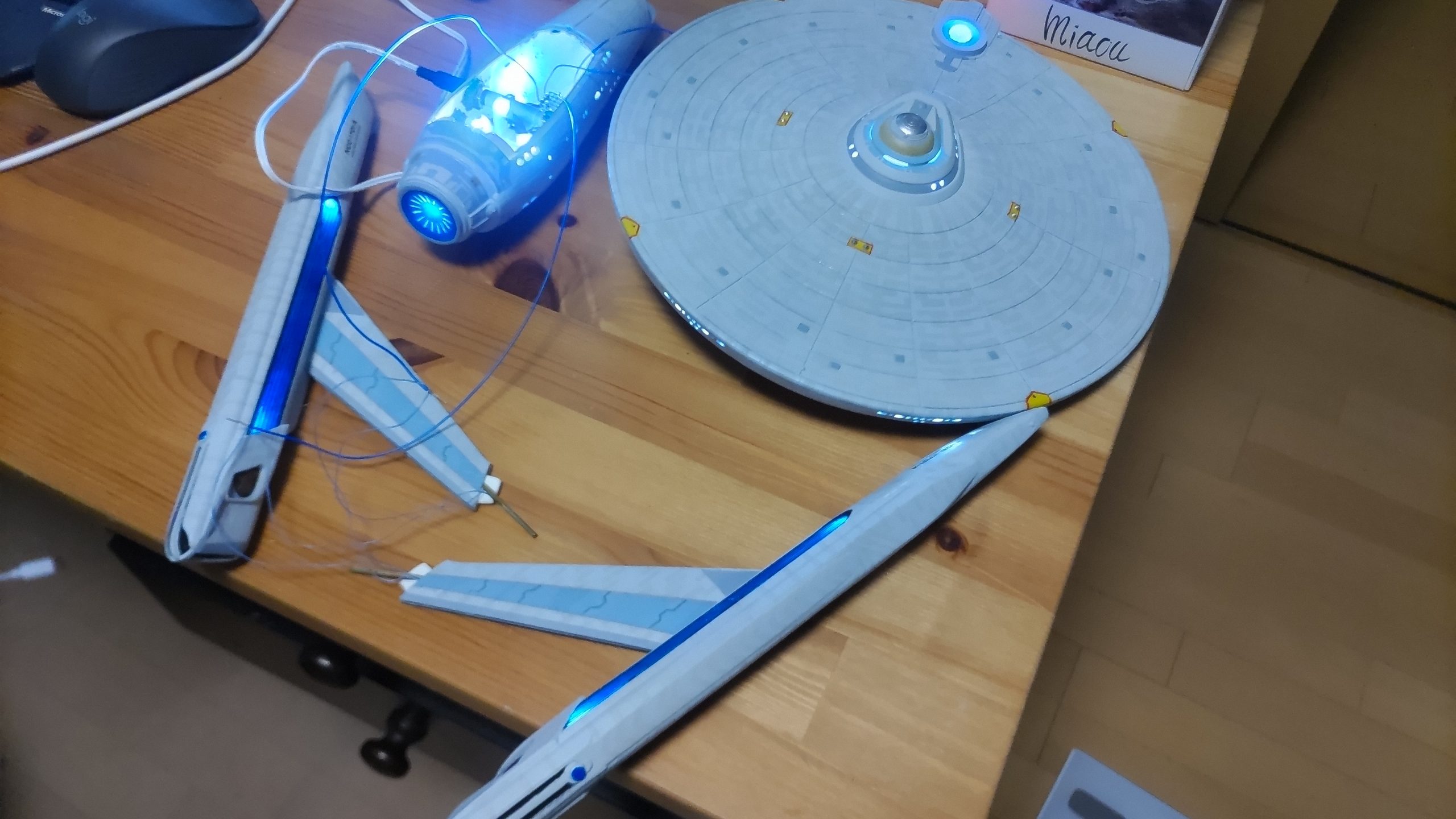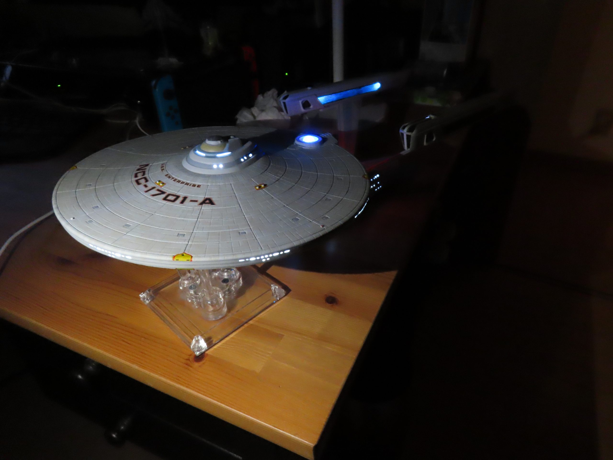 The deflector dish was a bit of trouble. I tried a couple of different ways to give it a ‘starburst’ look but ended up sanding down the whole thing back to bare plastic before the final iteration. That one was basically adding a ring of small hand cut stickers on the base plastic, then spraying clear blue and sealing it all with the matt varnish. The back white ‘bare’ plastic give a good flared look with the lights off, and helps brighten the ‘glow’ when the backlight is on.