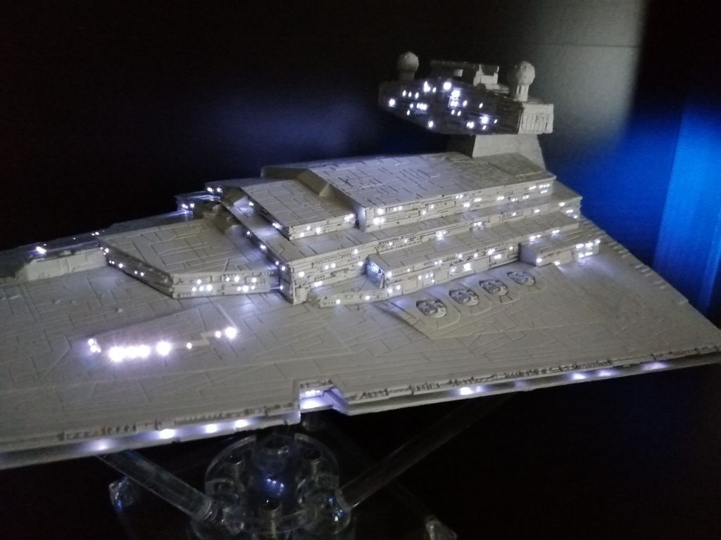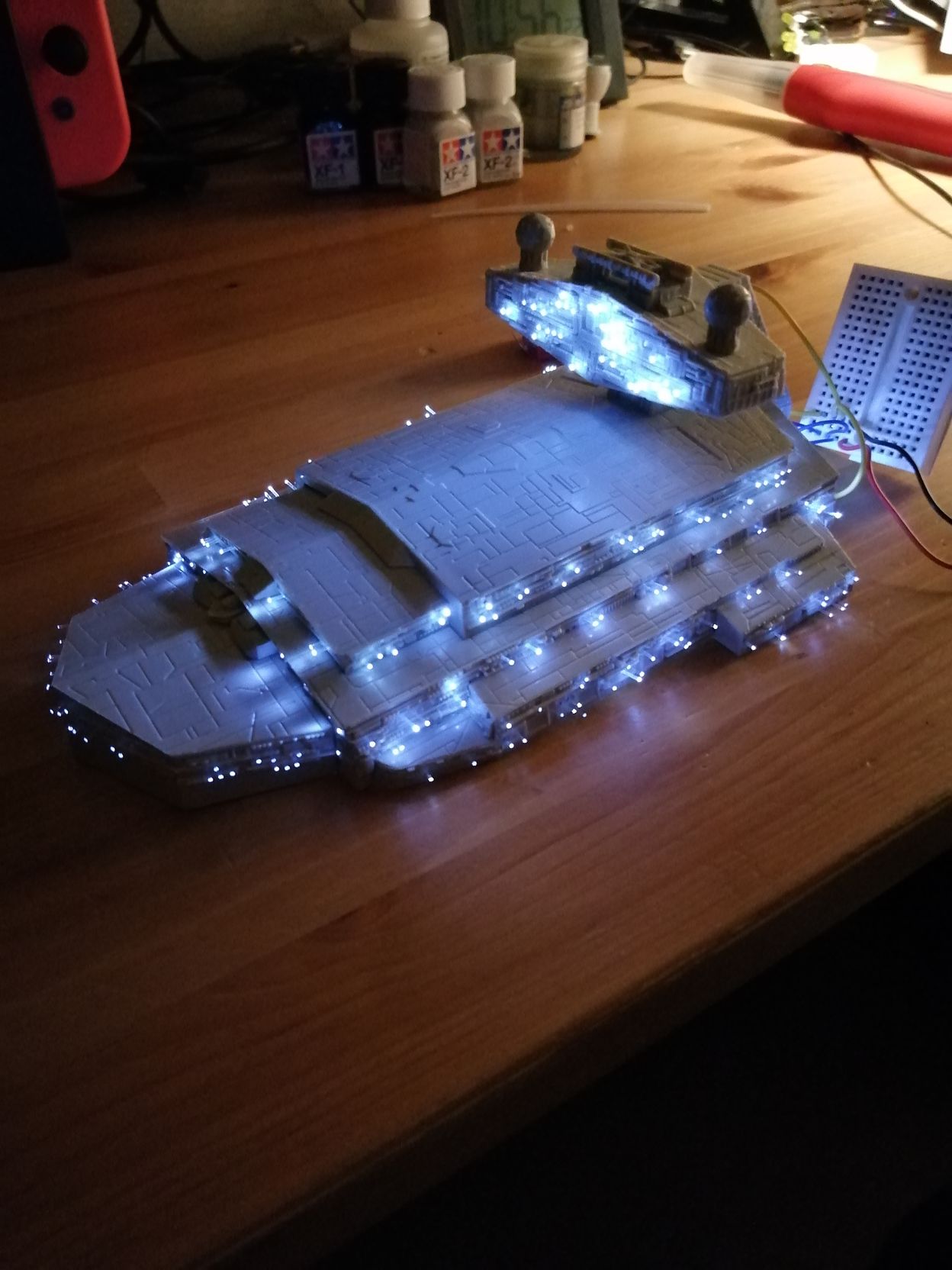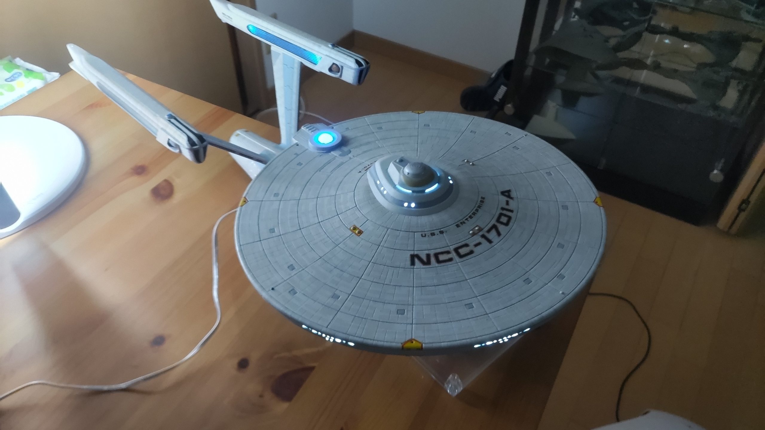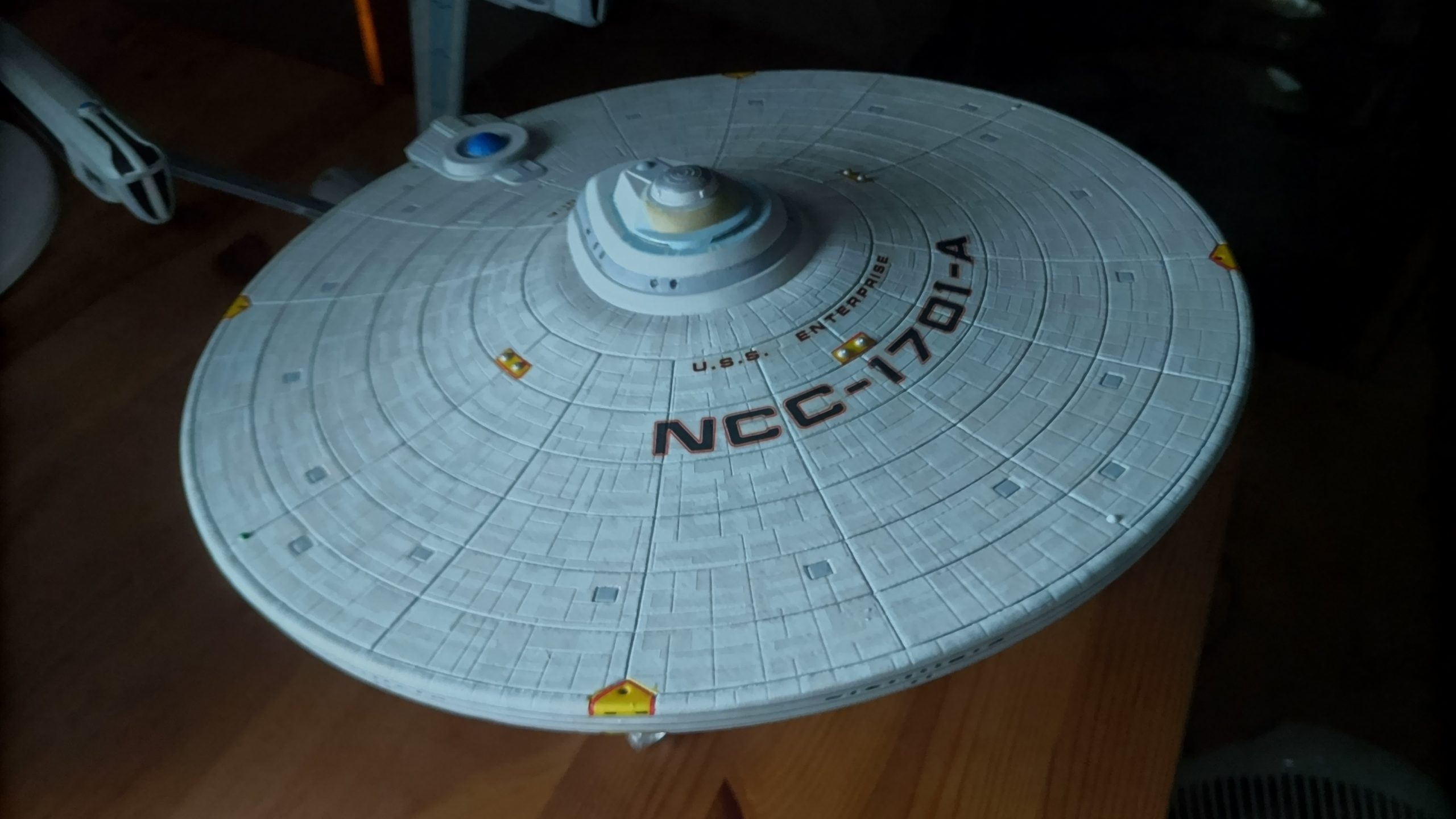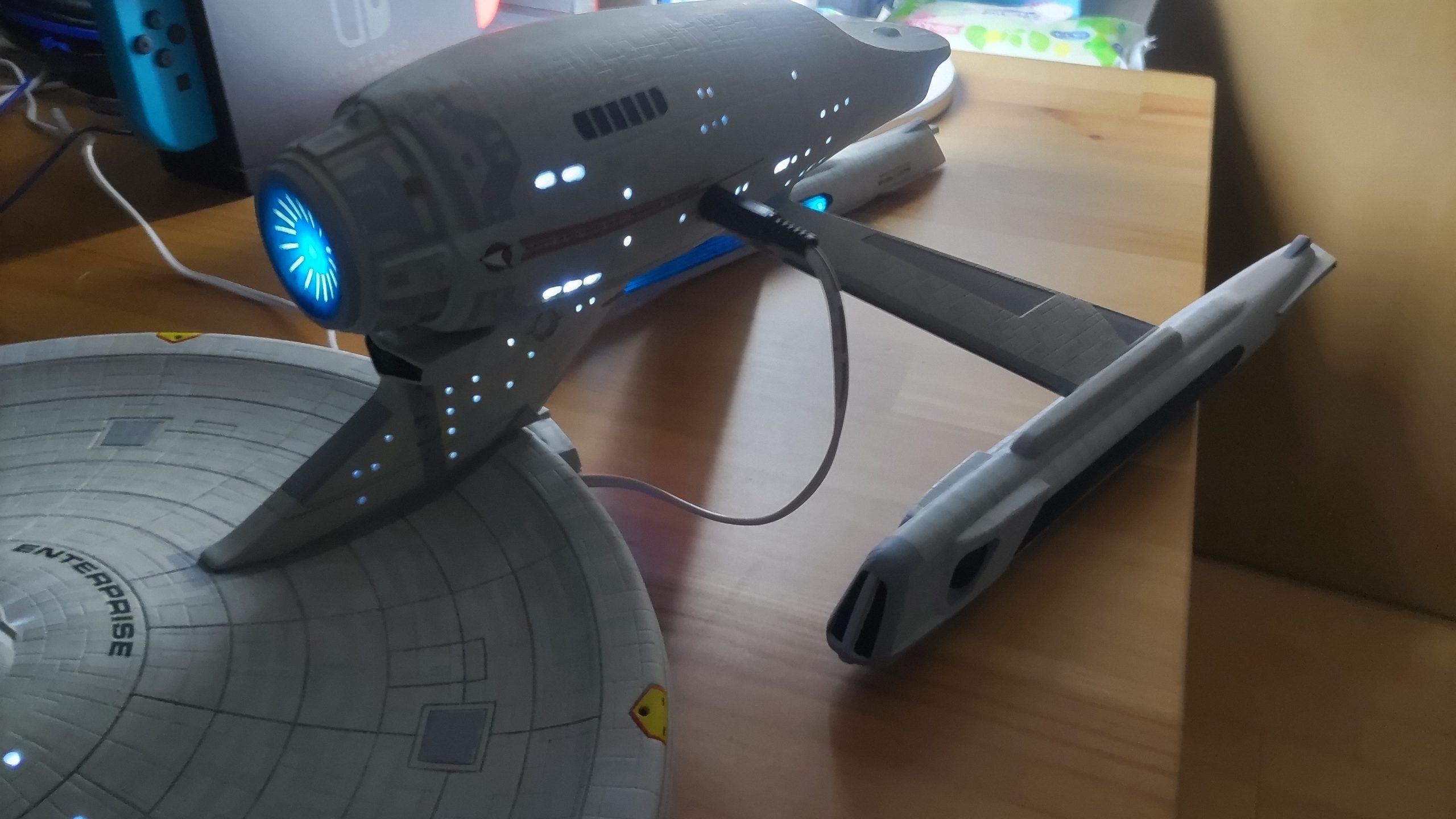 The deflector dish was a bit of trouble. I tried a couple of different ways to give it a ‘starburst’ look but ended up sanding down the whole thing back to bare plastic before the final iteration. That one was basically adding a ring of small hand cut stickers on the base plastic, then spraying clear blue and sealing it all with the matt varnish. The back white ‘bare’ plastic give a good flared look with the lights off, and helps brighten the ‘glow’ when the backlight is on.