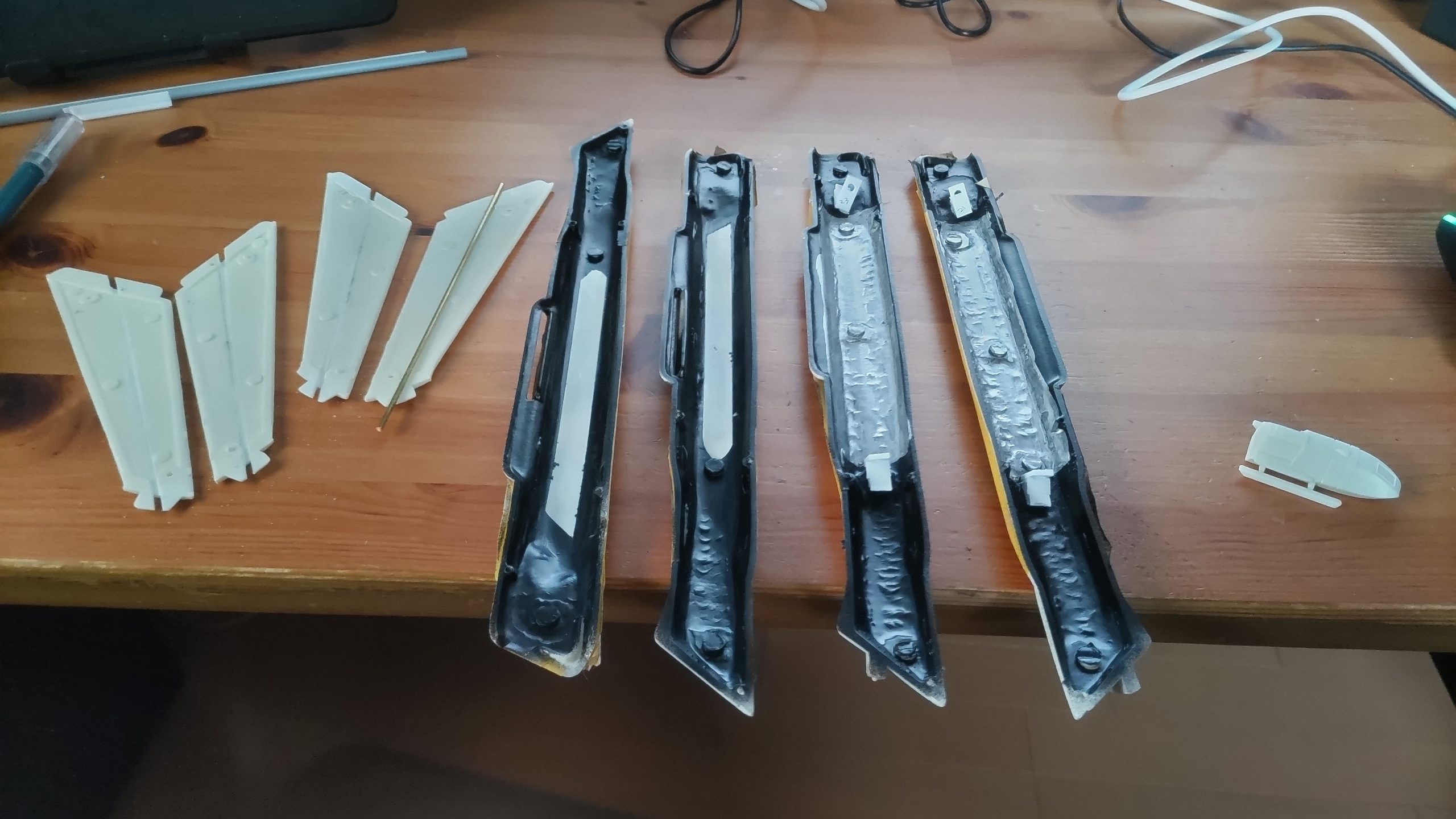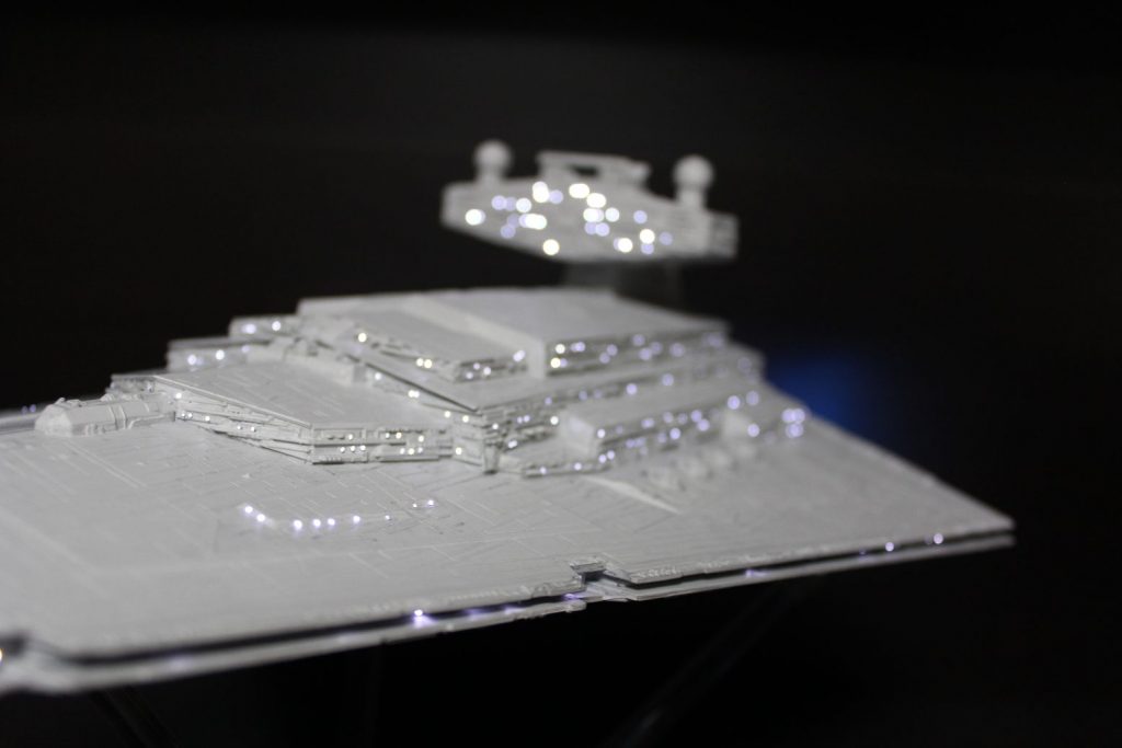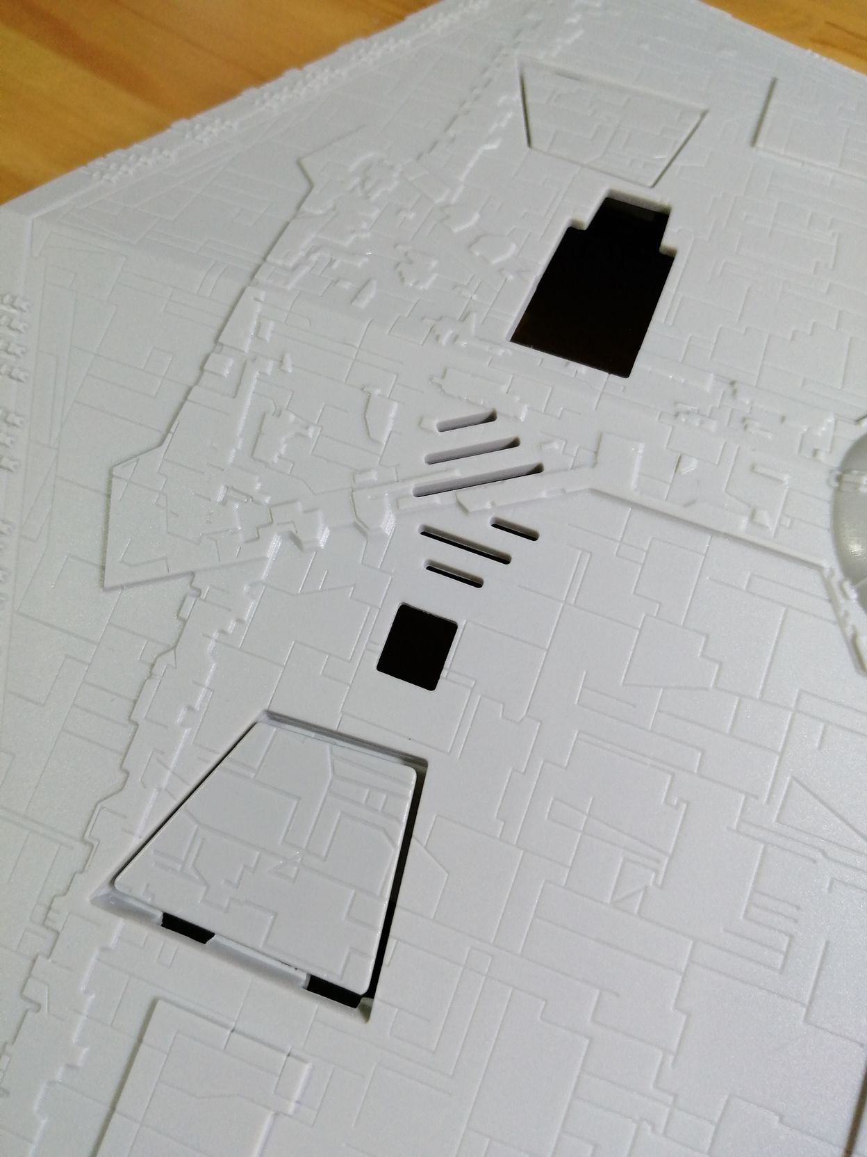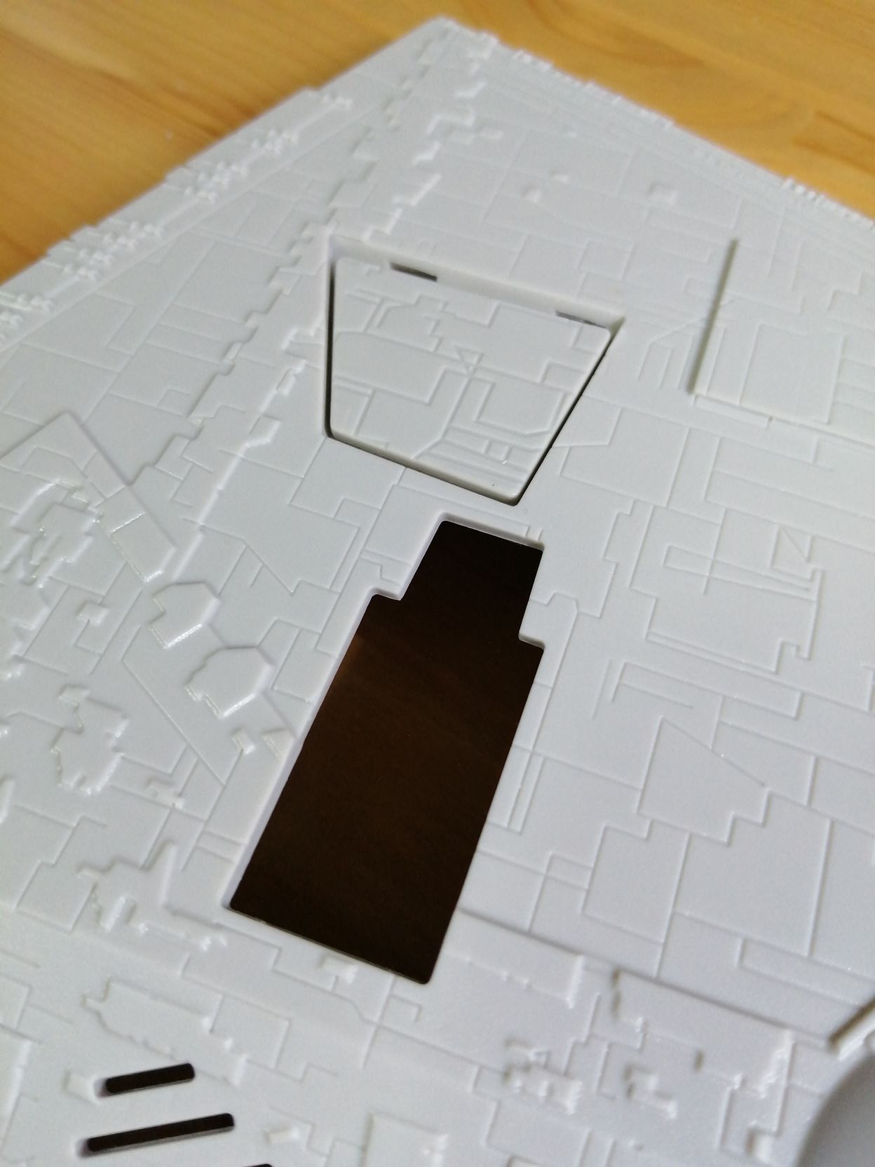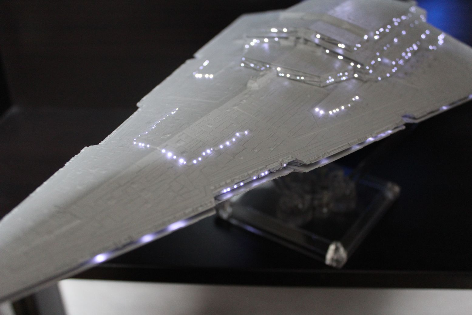 The deflector dish was a bit of trouble. I tried a couple of different ways to give it a ‘starburst’ look but ended up sanding down the whole thing back to bare plastic before the final iteration. That one was basically adding a ring of small hand cut stickers on the base plastic, then spraying clear blue and sealing it all with the matt varnish. The back white ‘bare’ plastic give a good flared look with the lights off, and helps brighten the ‘glow’ when the backlight is on.