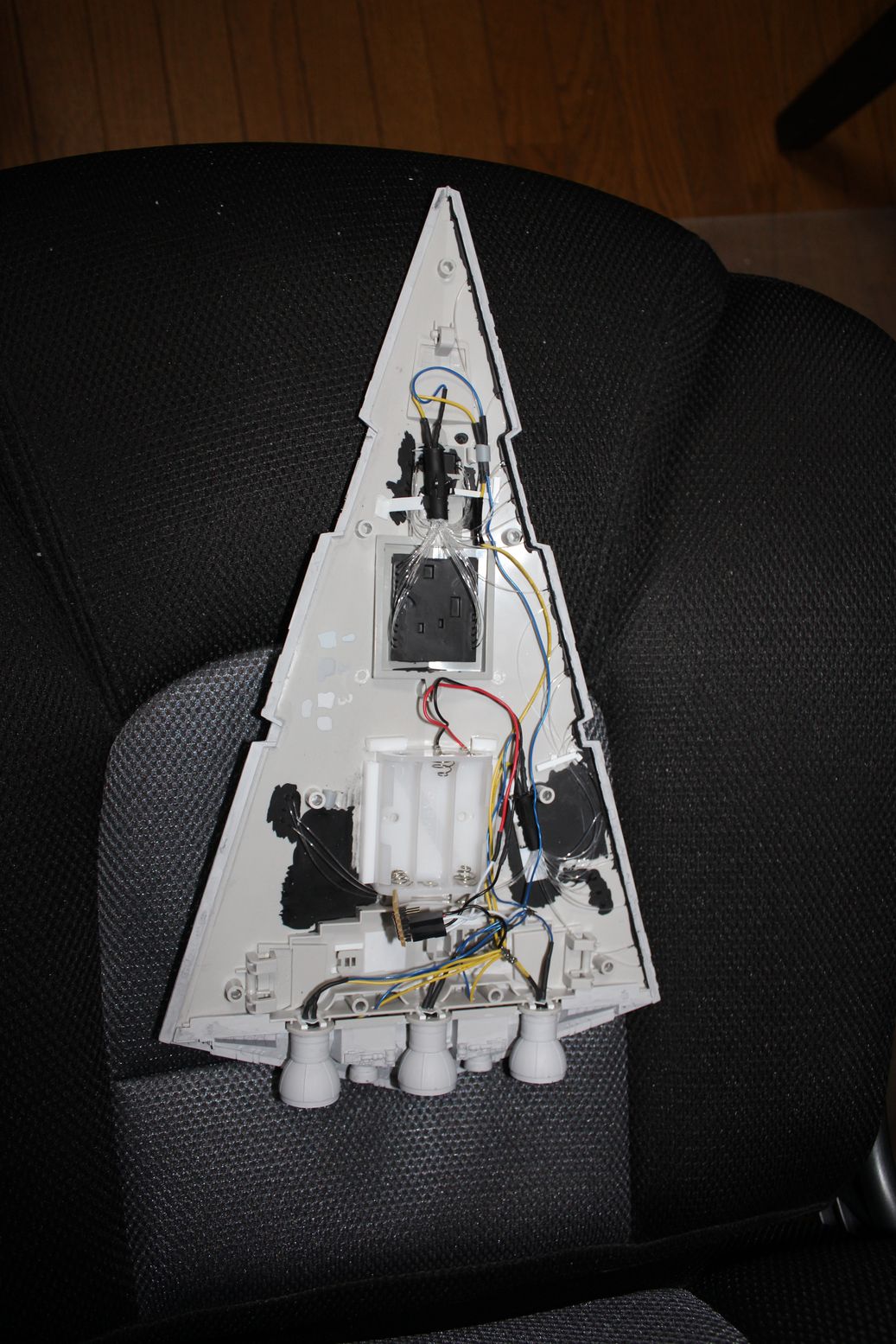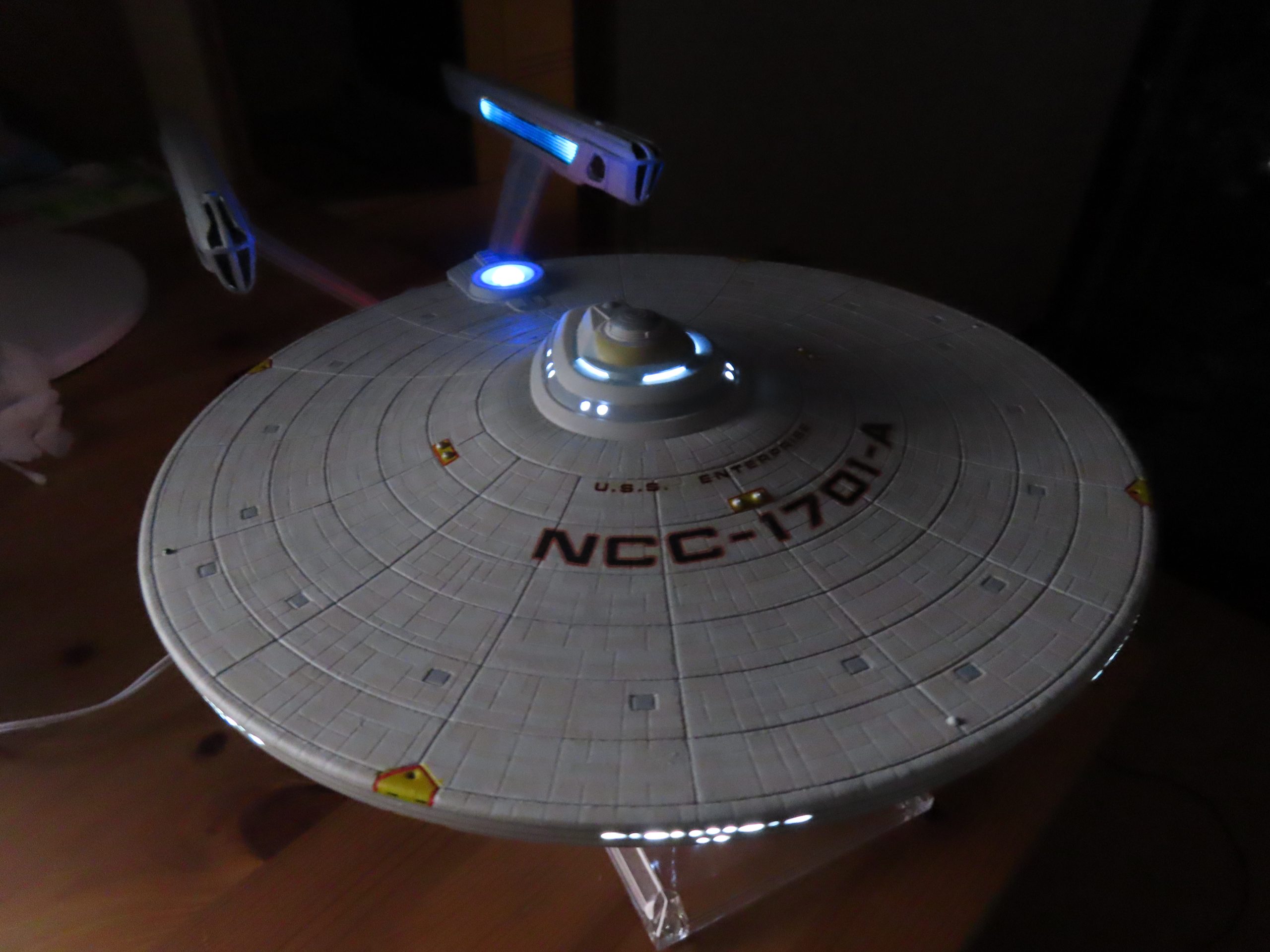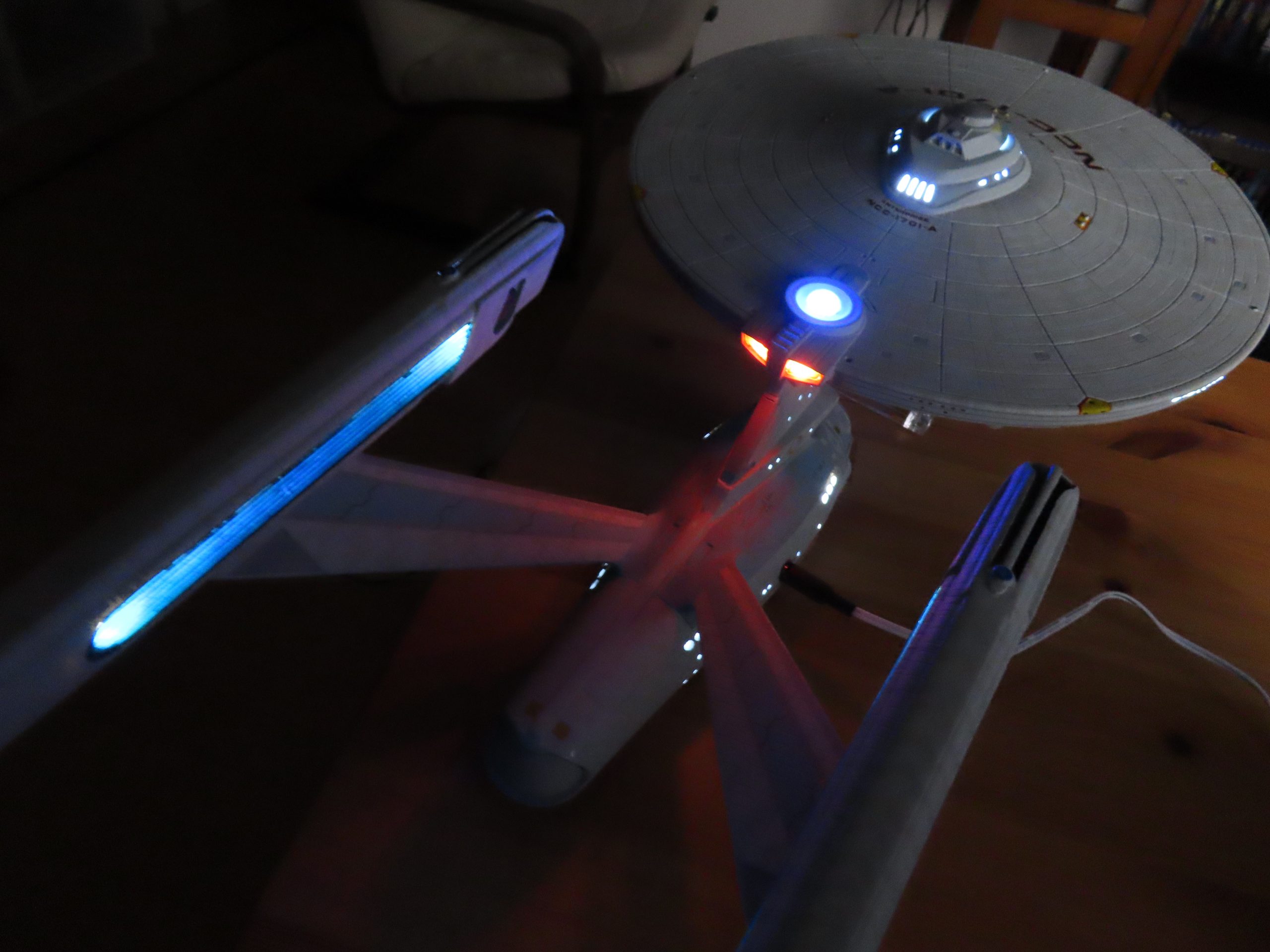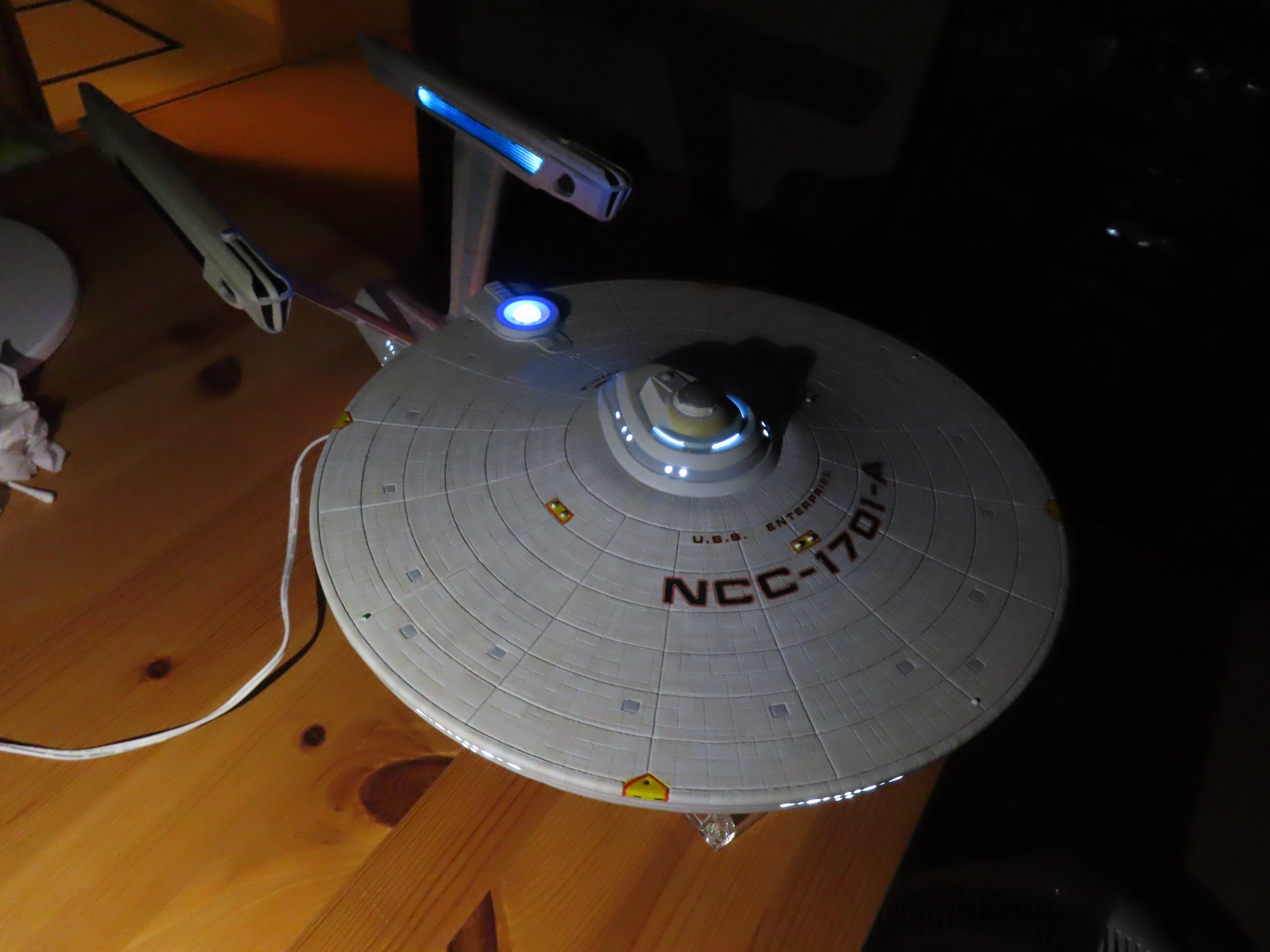 The lighting is rigged for 4.5 volt DC. I used a mix of 3mm white LEDs and chip style surface mount white LEDs . I did use some red 3mm LEDs for the impulse engines and a blue surface mount LED for the impulse crystal. The deflector dish, nacelle inner lighting, impulse engines and impulse crystal were all back lit through the plastic. Basically, a good bright LED could push right through the old white plastic and give a good glow. Pretty much the Raytheon effect some modelers used for faking spotlights.