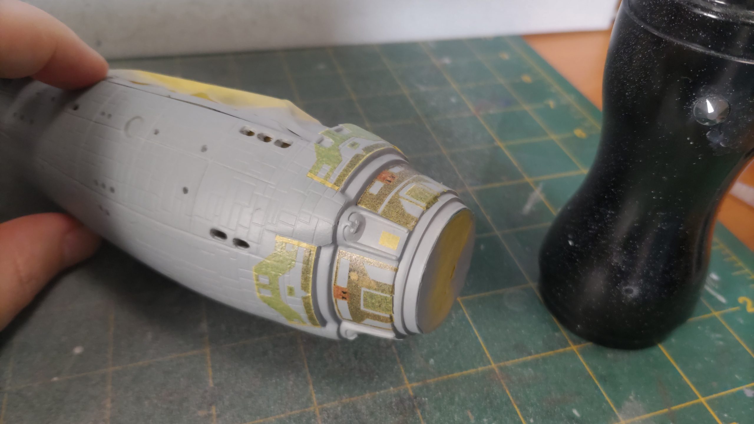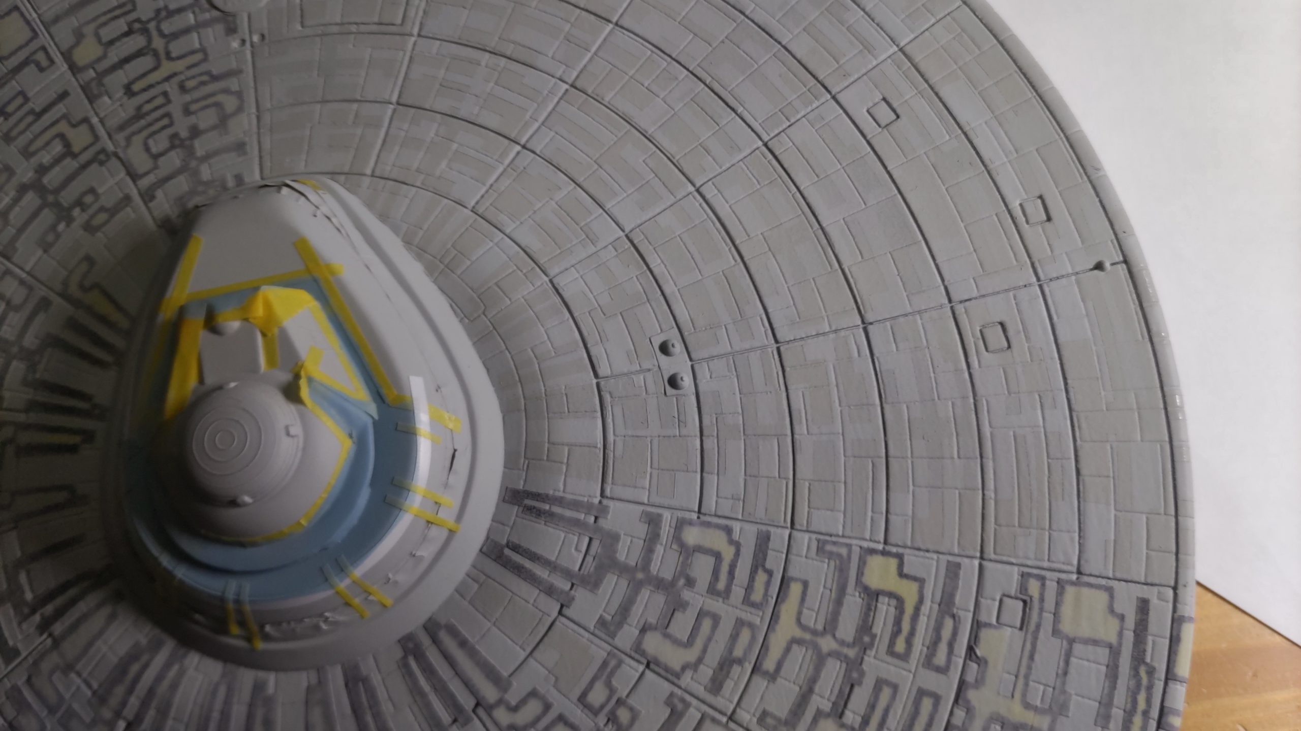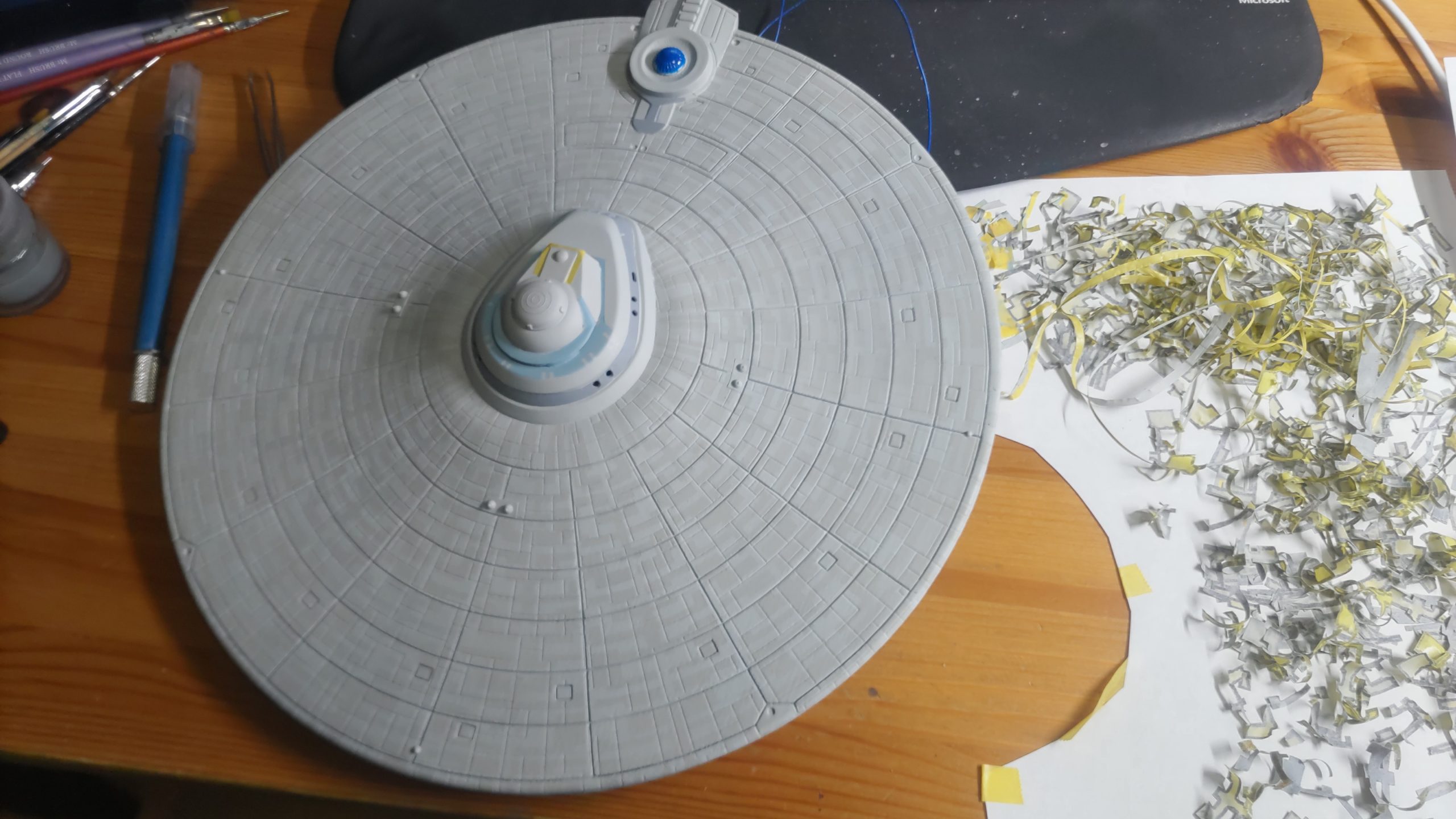 One of the big tricks with the Enterprise, and pretty much most Star Trek Federation ships, is the aztec patterns that are painted on. It’s a bit of razzle dazzle to add a sense of scale to the ships, a subtle rectangular like pattern across the whole ship. To tackle this, I started by masking off the parts that needed to keep the light gray primer as a accent color. Then I painted the rest of the ship with the darker of my two light gray colors, as the ‘highlight color’ of the aztecs. Then came a lot of tape masking. The main hull, pylons and nacelles are mostly done with patterns of hand cut 2mm and 3mm Tamiya tape.