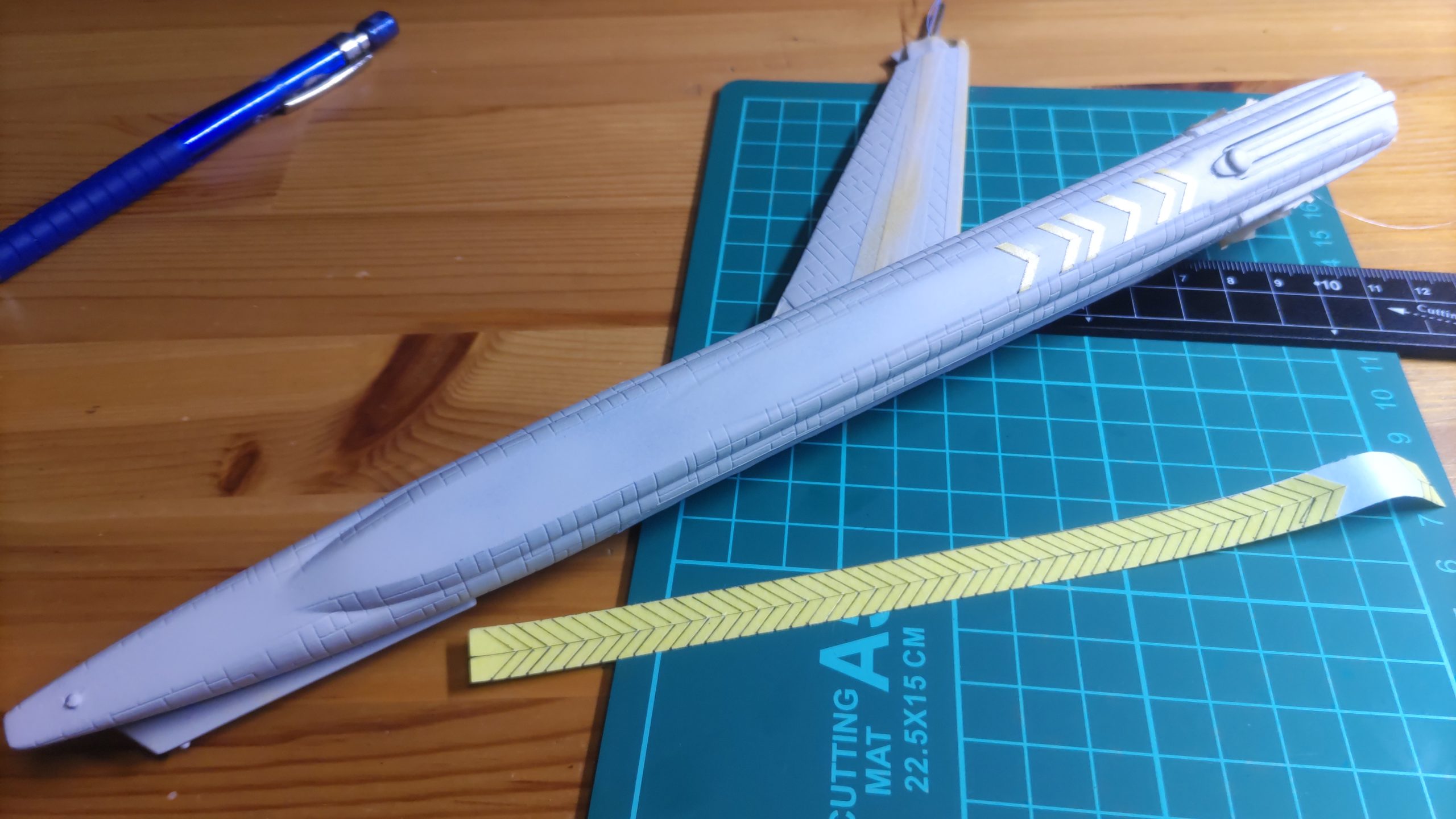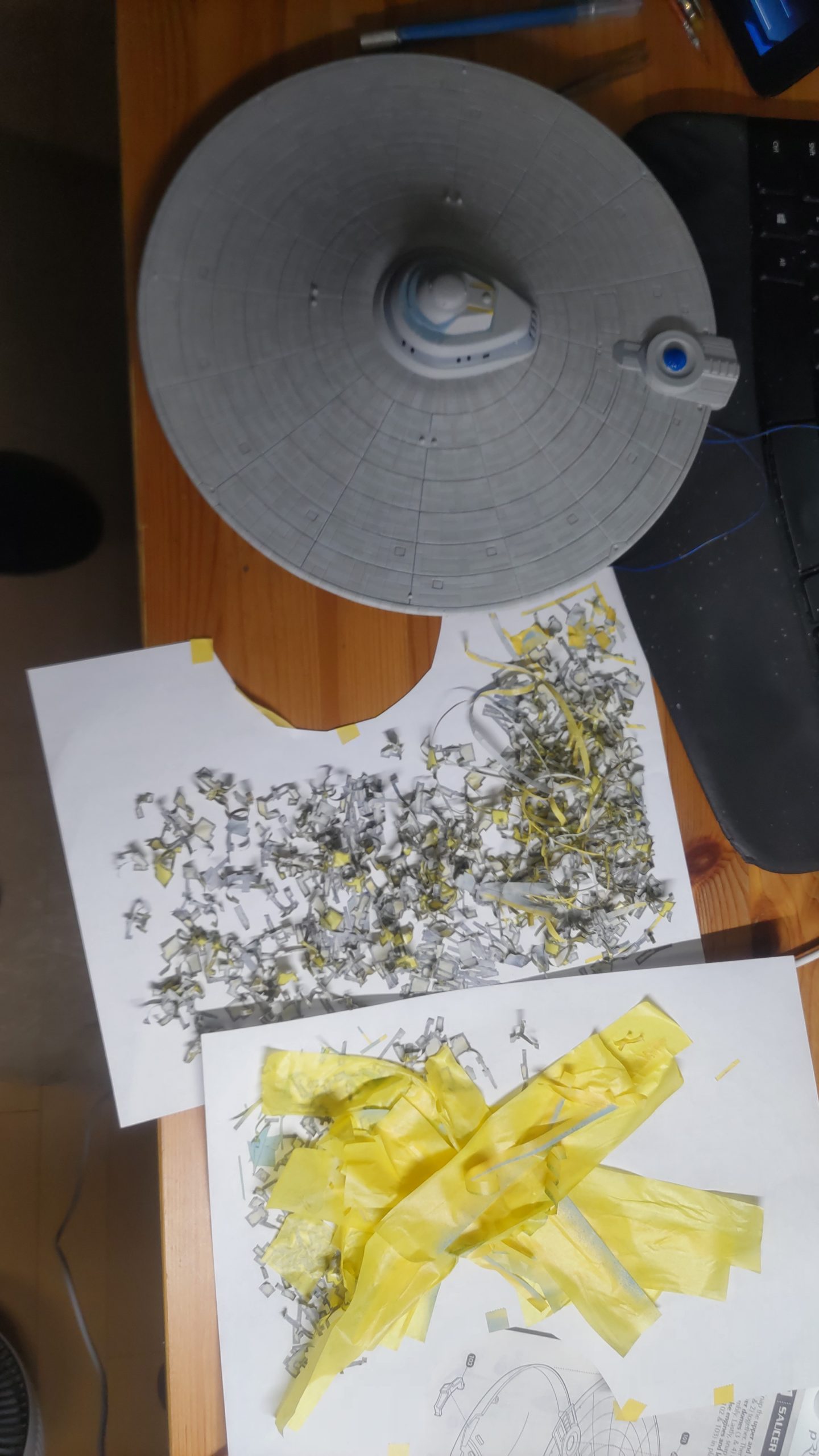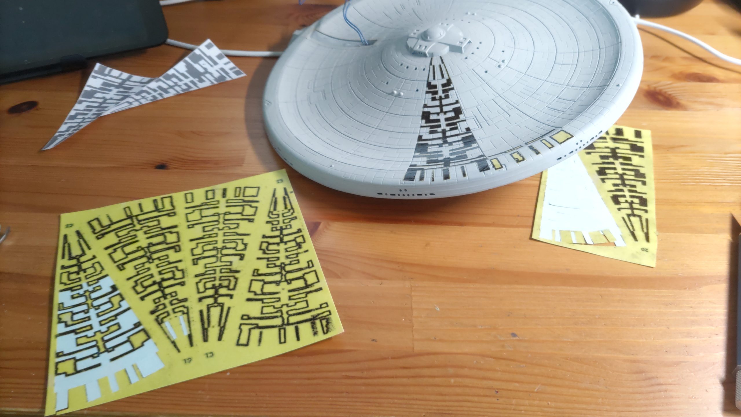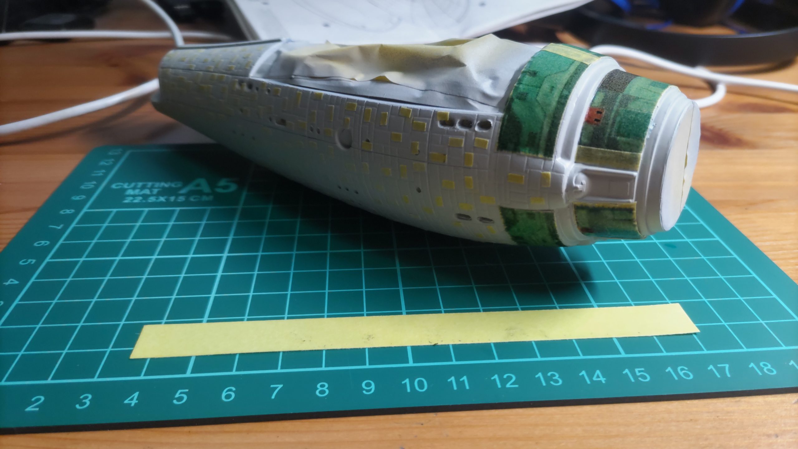 The strongback and nose of the engineering section have a different set of patterns. In all of those cases, I copied decals from the 1/1000 USS Enterprise refit model I have and then printed them out onto Tamiya sticker paper. I did have an issue with the ink from the printer not quite binding with the paper, even after having been left to dry for days. I fixed that by spraying a thin coat of gloss varnish over all of the sheets. It did bleed in some spots, but there was still enough of a pattern that I could use it to cut out the patterns.