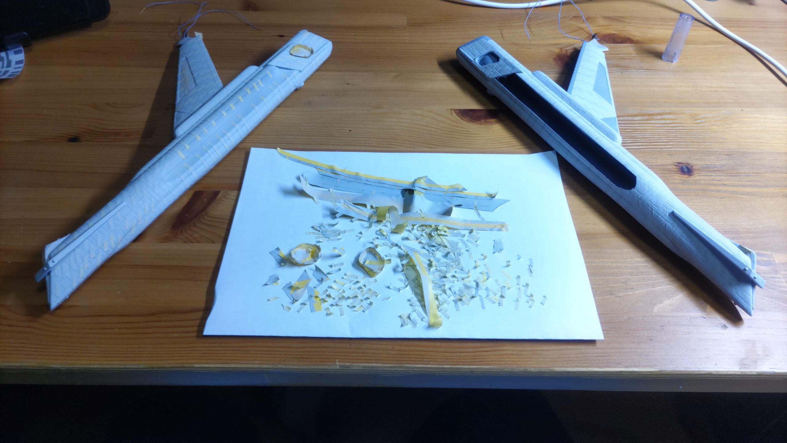 So, after that, a lot of cutting out of the patterns and applying them to the kit and a final coat of the lighter gray to finish off the work. There is little as satisfying as removing so much masking material and finally seeing the result of all that work come out just like you planned.